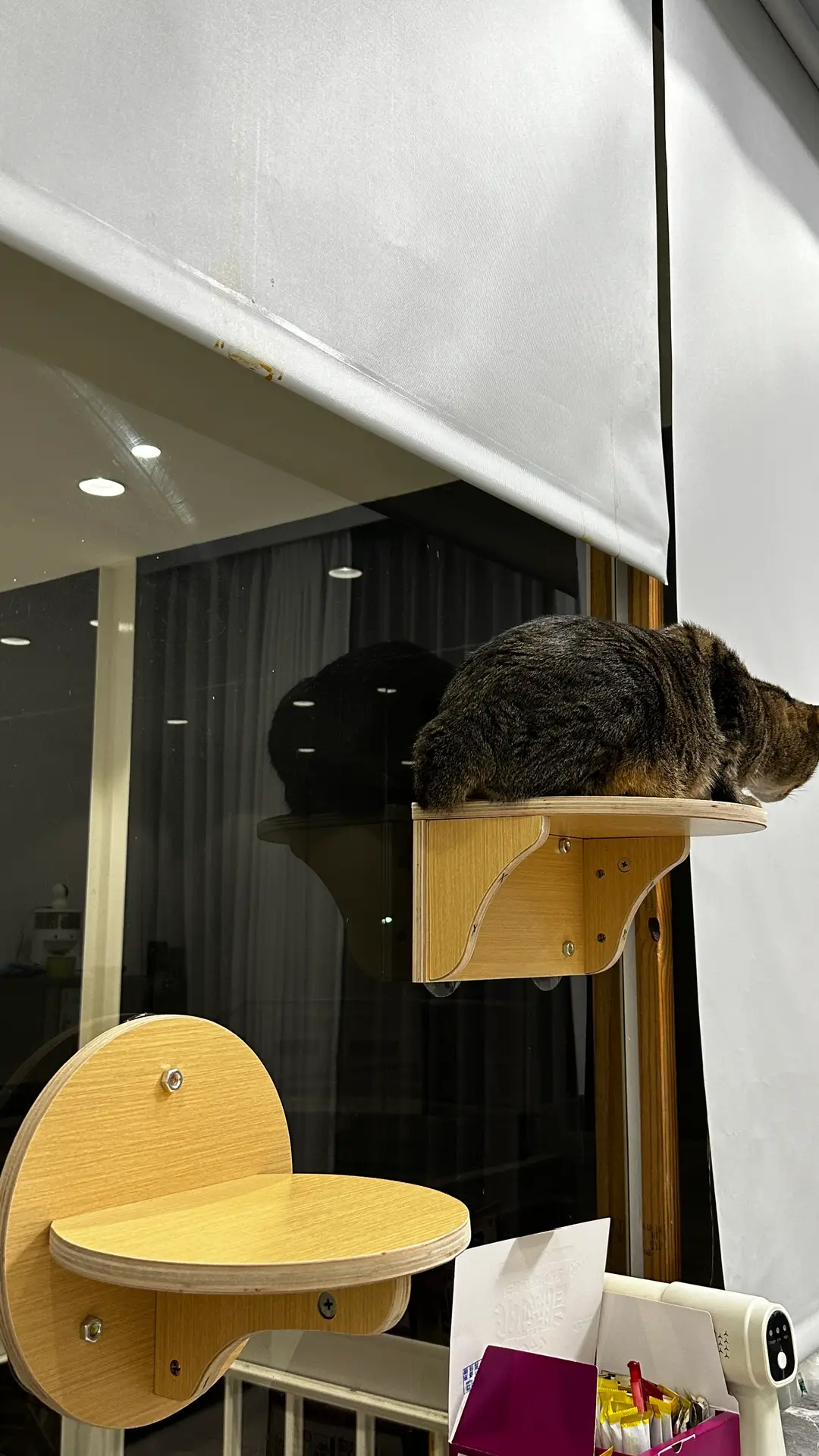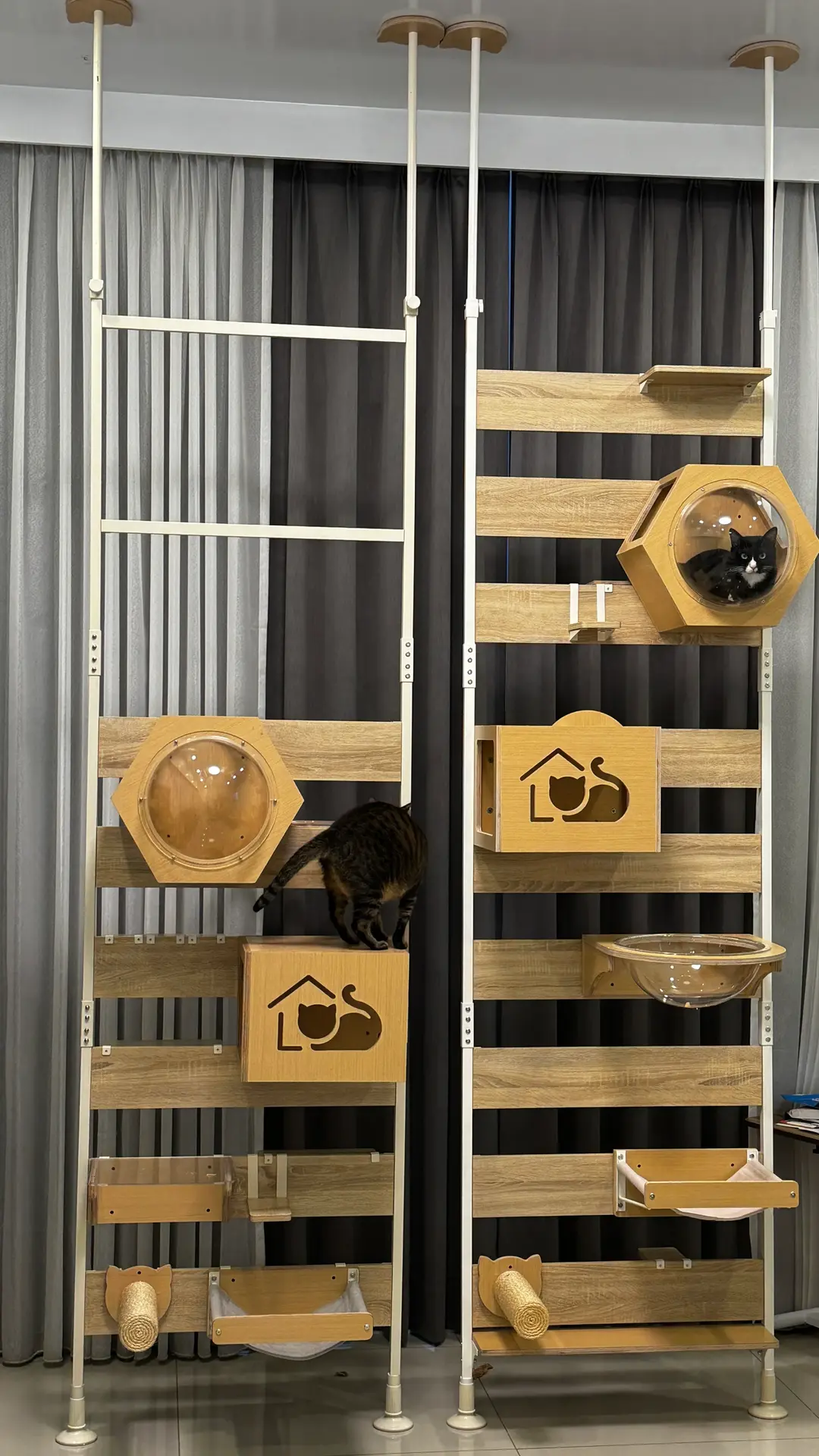 超好的設計貓貓超喜歡🥰,頂天立地不用再鑽孔了,也有附送吸盤配件,除了可以懸掛之外,也可以吸在玻璃上跟窗戶上,貓挑架的細節做得非常到位而且超級穩固,到工廠自取超級優惠非常推薦👍